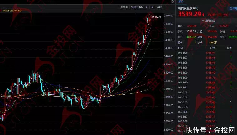 隔夜,现货黄金价格飙升超过1%,一举突破3500美元的历史高位,最高触及3539.88美元,最终收报3533.40美元。今日欧市盘中,黄金刷新纪录高位3546.99美元,目前在3540美元附近徘徊。